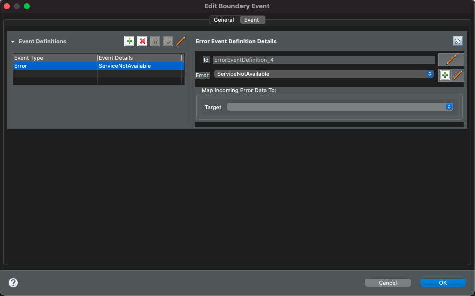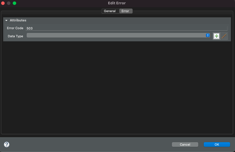 data type - optional data type of the error being produced which can be mapped to data object of the workflow instance