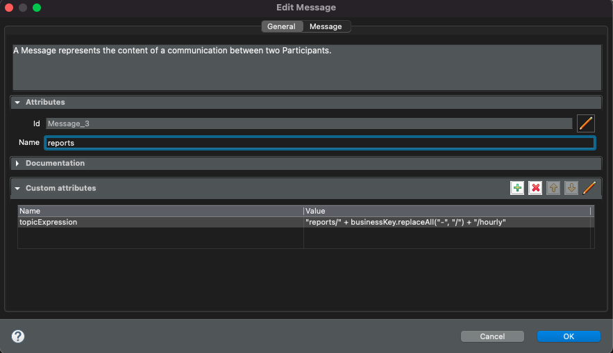 topicExpression - instructs what is the expected topic in the message broker this message should be sent to - if not defined name of the message is used - applies to MQTT only